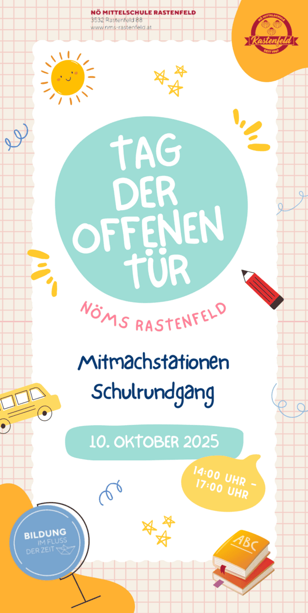 Bring deine Familie und Freunde mit und erfahre, warum die Mittelschule Rastenfeld genau der richtige Ort für deine schulische Zukunft ist!