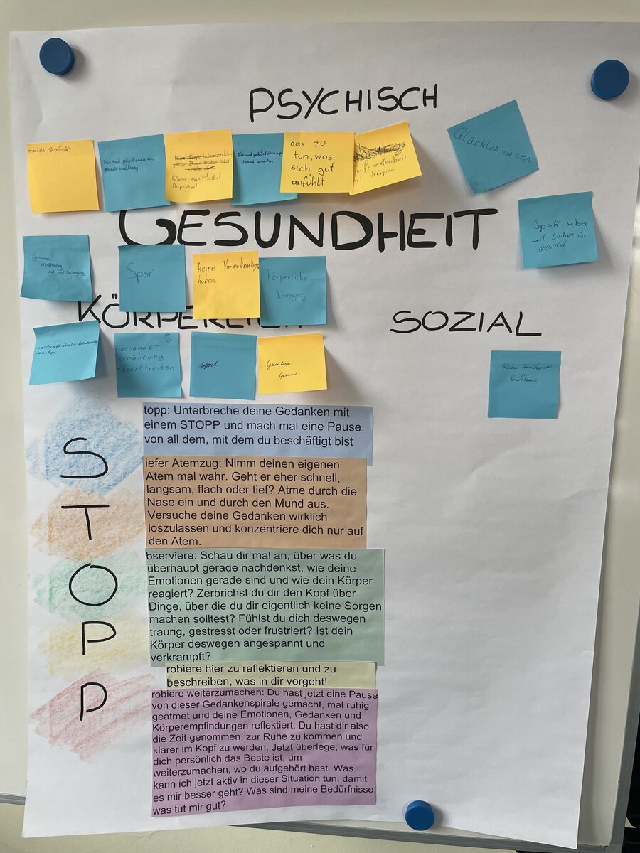 Zu Beginn beschäftigten sich die Jugendlichen damit, was „Gesundheit“ eigentlich bedeutet – sowohl körperlich als auch seelisch. Anschließend standen Achtsamkeitsübungen im Mittelpunkt, bei denen die Schülerinnen und Schüler lernten, bewusst innezuhalten und auf ihre eigenen Gefühle und Bedürfnisse zu achten. In einer weiteren Übung reflektierten sie, wie sie sich aktuell fühlen und was ihnen im Alltag guttut.